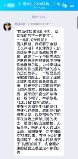 组织各支部一同观看以抗美援朝战争中长津湖战役为背景拍摄的电影《长津湖》。研究生2020级传播哲学党支部积极响应,组织支部内党员、发展对象以及积极分子参与此次活动。