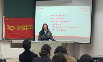 研究生2021级传播哲学党支部于J4505B教室召开《中国共产党章程》专题学习会暨新闻写作专题培训会,大会由研究生2021级传播哲学党支部书记陈子龙同志主持推进,支部共37名党员、党员发展对象、入党积极分子参加会议。大会主要内容是集中学习《中国共产党章程》以及新闻写作规范。