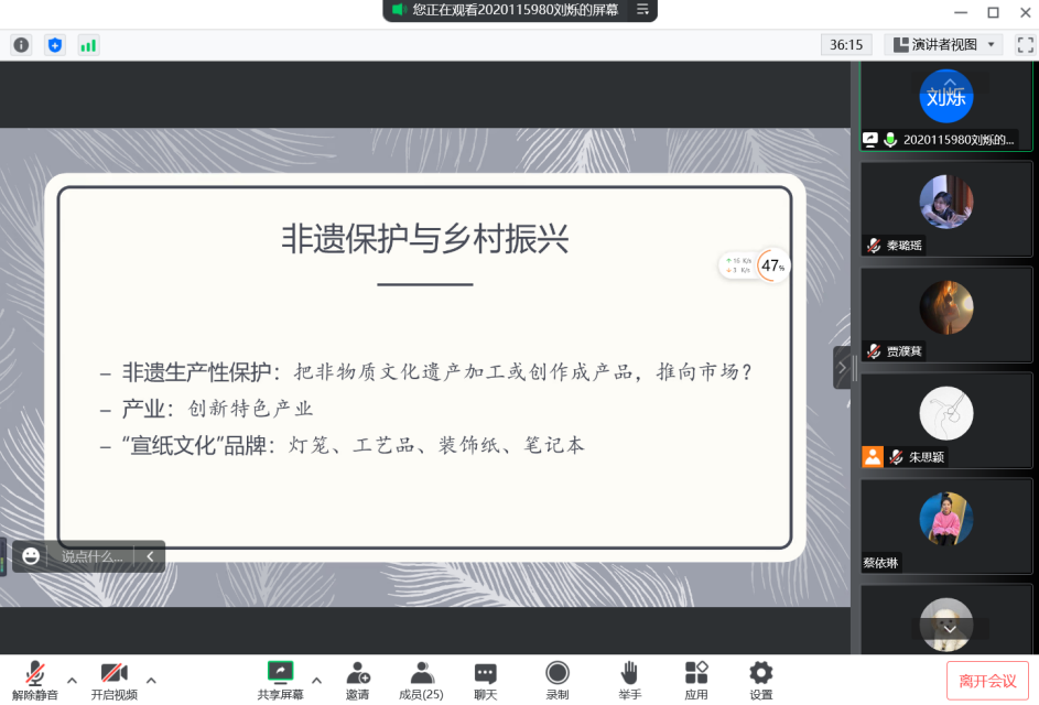 第二部分为支部小组分享展示。党支部的四个小组结合家乡特色,自主拟定主题,依次与大家交流分享。刘烁同志与大家分享了“宣纸”这一非物质文化遗产,通过观看制作宣纸的视频,详细介绍了宣纸的分类、历史渊源、故事传说等内容。随后,刘烁同志联系党的二十大精神,提出了“非遗保护与乡村振兴”这一主题,引导支部成员进一步思考二者之间的关系。
