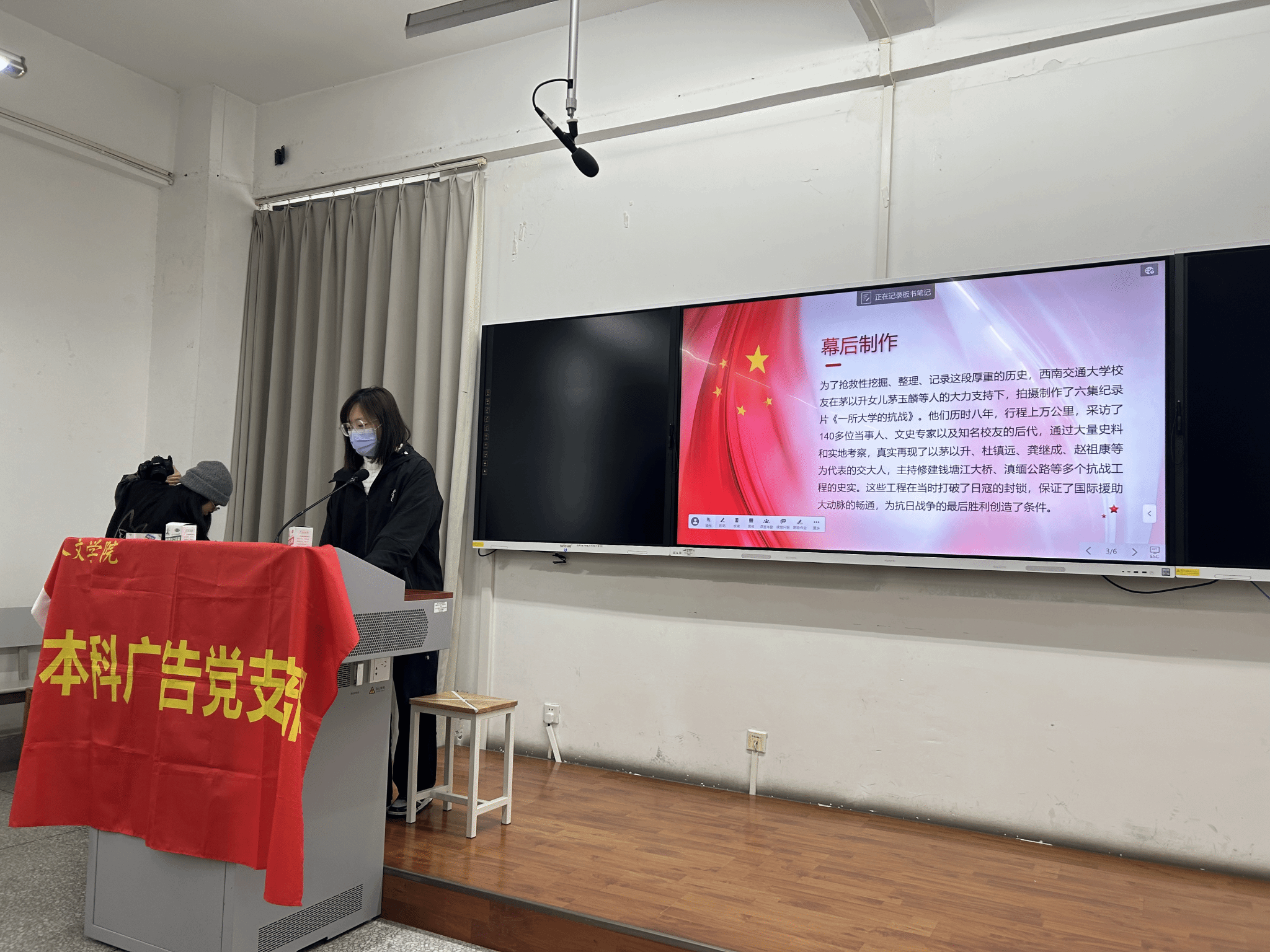 为引领支部全体成员回味文化底蕴,重温百年校史,深化个人感悟,结合自身学习情况与个人成长体会,传承交大红色基因。2023年11月30日下午4时,本科广告党支部在X8323开展《一所大学的抗战》集中观影活动。本次活动由高浩扬同志主持。