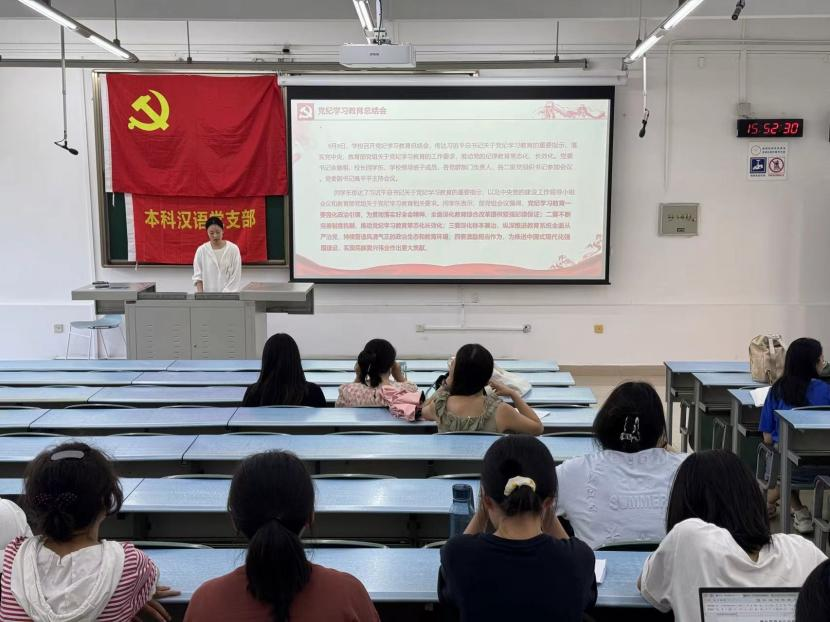 2024年9月19日15:50,本科汉语党支部于X2214教室开展主题党日活动,由满珍明同志主持,支部全体成员参加学习。本次活动包括两个主题:一、学习学校党纪学习教育总结会议精神,复盘总结支部党纪学习教育情况;二、开展主题为“中华传统美德”的特色主题党日活动。
