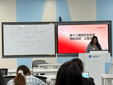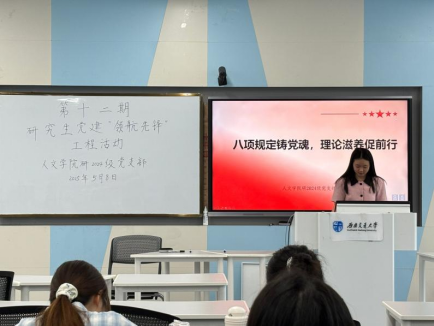 研2024级党支部、研究生会临时团支部在九里校区J4204教室开展第十二期研究生党建“领航先锋”工程活动。本次活动由潘诒堃同志主持,支部成员和入党积极分子共同参与。本次活动聚焦中央八项规定精神的深入学习与贯彻落实,旨在推动全面从严治党向基层延伸,进一步夯实青年党员廉洁自律的思想根基。