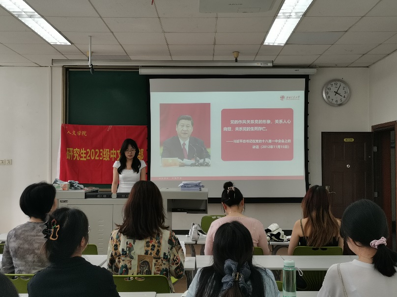 研究生2023级中文党支部在九里校区J4220开展6月主题党日活动,以“开展深入贯彻中央八项规定精神学习教育,做担当民族复兴重任的新时代交大人”为主题,采用党支部书记讲专题党课的形式,围绕中央八项规定精神及相关政策文件、习近平总书记近期重要讲话精神开展专题学习。本次活动由支部书记王艺橙同志主持。