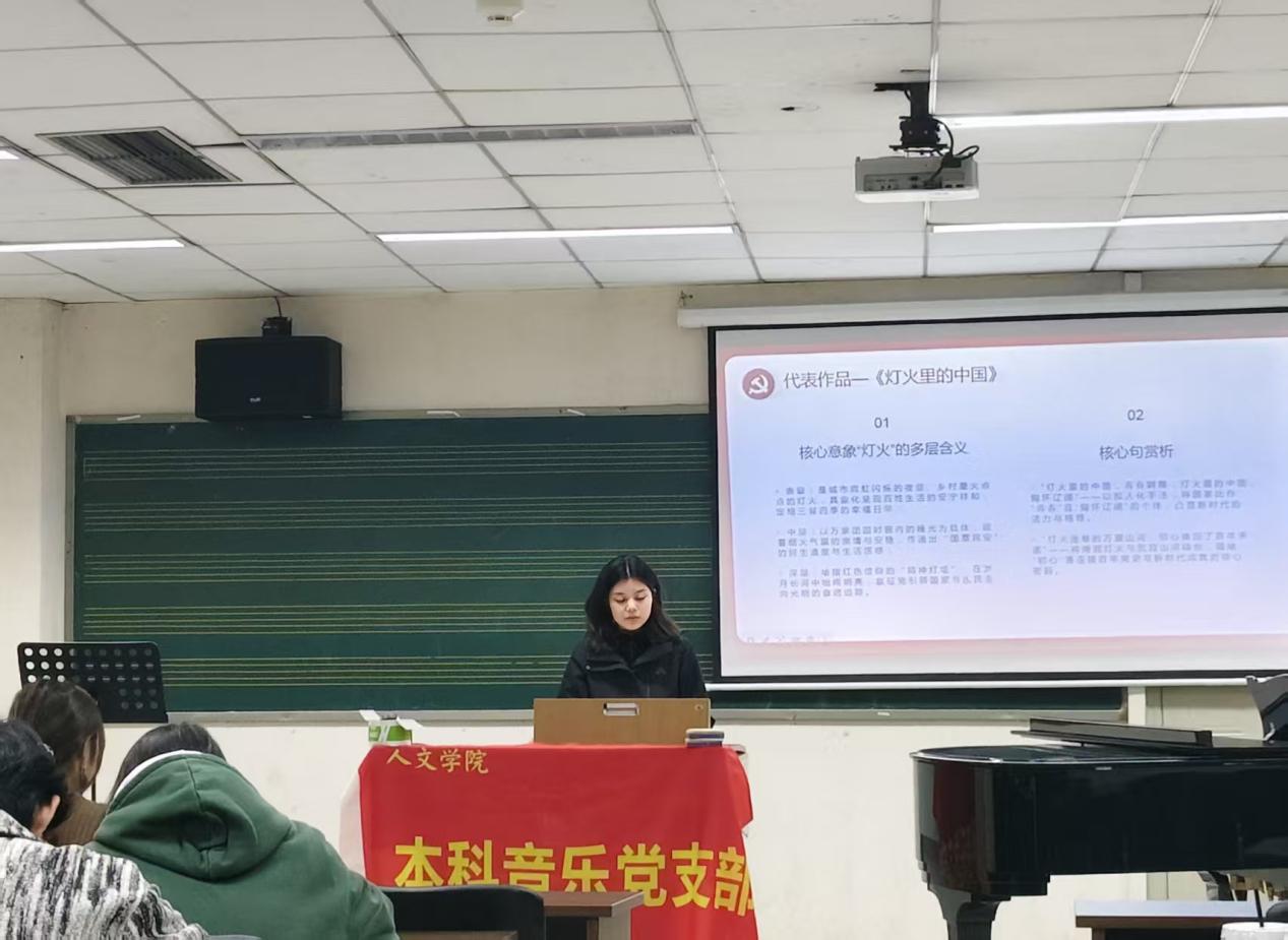 为深入学习贯彻党的二十大精神,弘扬中华优秀传统文化、革命文化和社会主义先进文化,充分发挥音乐专业学生党员的专业特长与先锋模范作用,2025年10月至11月,本科音乐党支部精心策划并开展了三场主题鲜明、形式多样的示范性党支部活动,以音乐为纽带,将思想引领、专业实践与文化传承深度融合,为支部成员呈现了一系列兼具思想性与艺术性的红色文化盛宴,有效增强了党支部的凝聚力与战斗力。