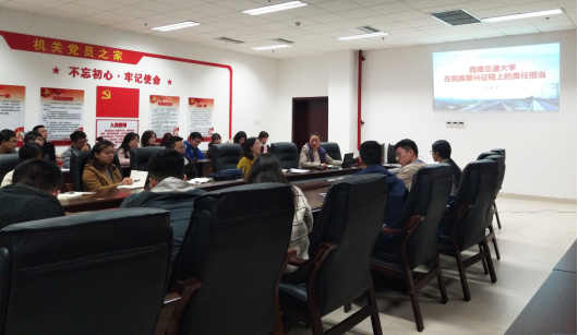 本科汉语支部结合工作实际,联合交运学院学生党支部,邀请学校机关党委副书记、纪委书记陈璐同志在综合楼104会议室为同志们进行主题宣讲,学习《王顺洪为全体中层干部讲授党课:在交通强国征程上西南交大的责任担当》,传达王顺洪同志专题党课精神,宣传交大人先进事迹,强化党员的使命担当。会议由爱看影视