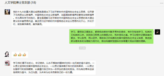本次主题党日活动开展热烈,党员同志们通过理论学习,结合当下热点,认为博士生党支部在这次新冠肺炎疫情防控阻击战中,很多支部成员挺身而出,在祖国和人民最需要的时刻“逆行而上”,不畏艰险、冲锋在前,把青春书写在抗疫一线,用实际行动诠释了新时代青年的理想与奉献、使命与担当。