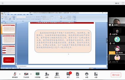 最后,中文教工支部教师作了热烈讨论。周俊勋教授指出,中文系党员教师在疫情期间捐资、捐物,做出了先进表率,之后应当继续坚持。沈如泉副院长在疫情期间对研究生面试工作做出全面部署,对参加面试工作的老师们表示感谢,特别对青年党员教师魏刚老师的辛勤付出提出表扬。广大教师认为,在习近平总书记的带领下,全国人民团结在总书记周围一定能够全面取得抗疫工作的胜利。