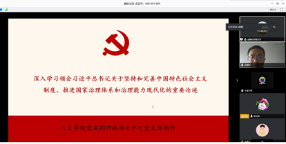 2020年5月21日下午3点,中文系教工支部全体党员教师在赵静副教授、支部书记吴德利老师的带领下学习了《深入学习领会习近平总书记关于坚持和完善中国特色社会主义制度、推进国家治理体系和治理能力现代化的重要论述》和《学习贯彻习近平总书记在统筹推进新冠肺炎疫情防控和经济社会发展工作部署会议上的重要讲话精神》,会议由支部书记吴德利老师主持。