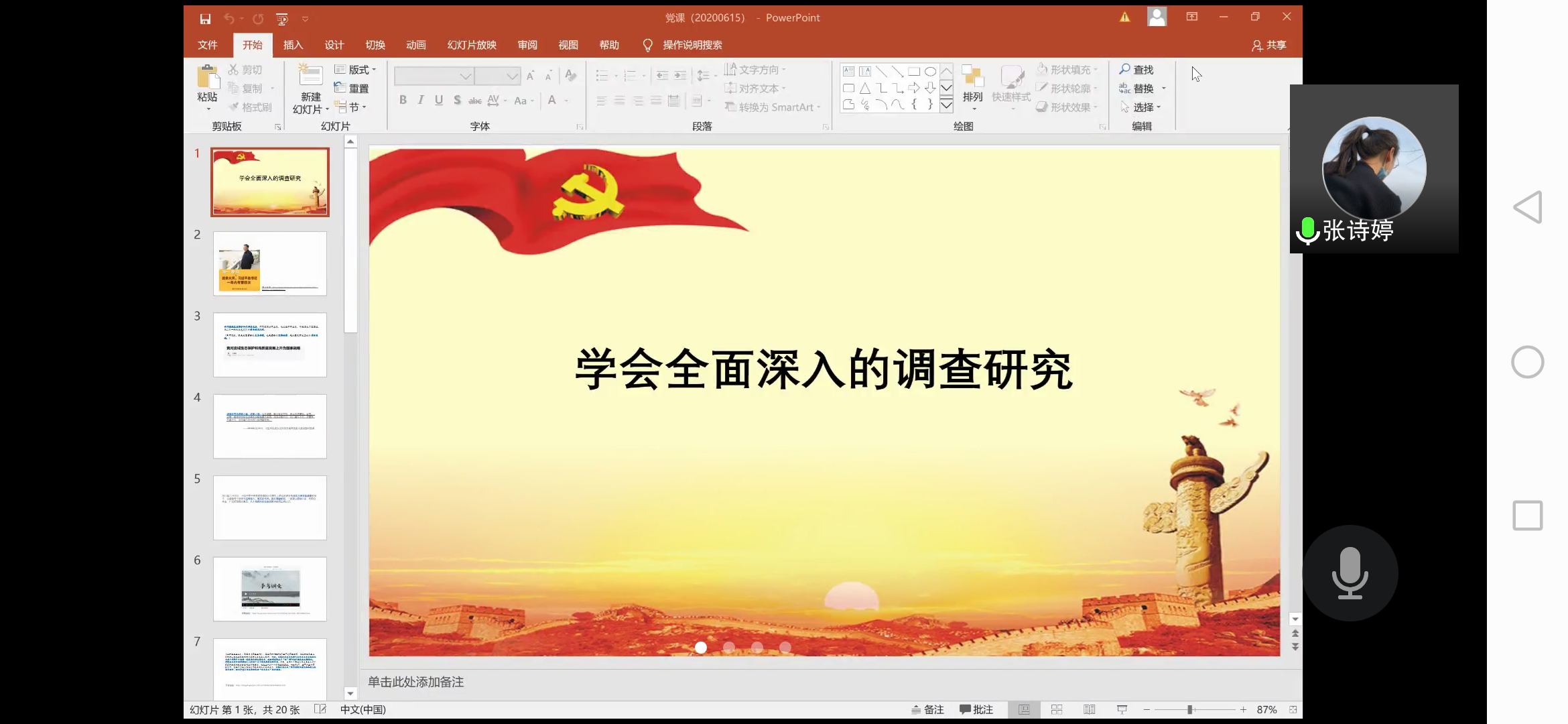 6月15日上午11:00, 2018级硕士传播哲学党支部通过腾讯会议平台开展线上学习活动。学院党委委员张诗婷为支部成员讲党课,学习专题为学会全面深入的调查研究,本次会议由支部书记李倩主持。