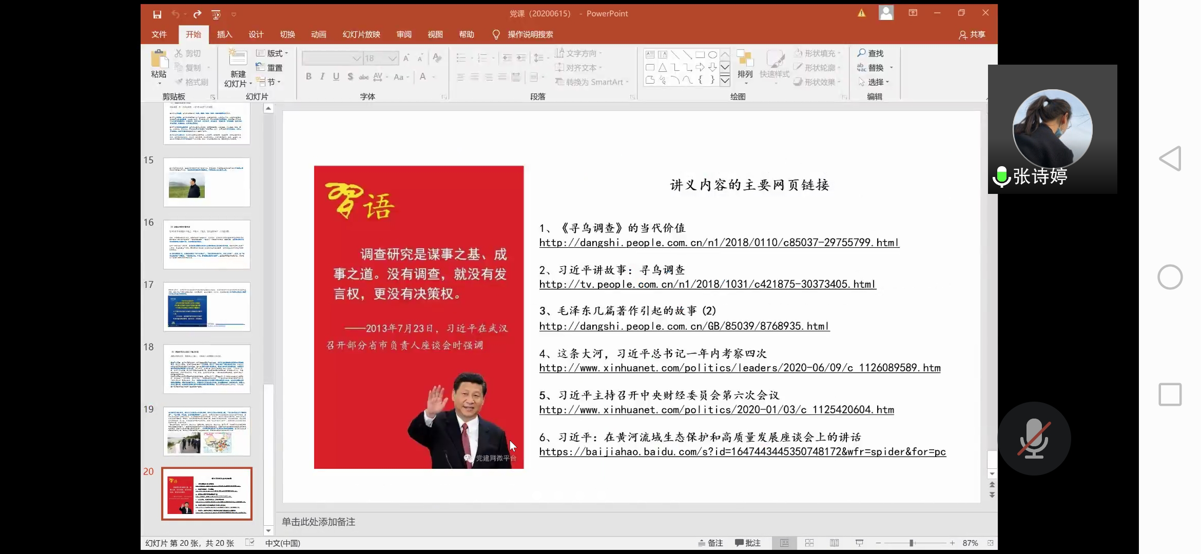 张诗婷老师分别从习近平总书记一年内四次考察黄河、习近平总书记在中央党校进修班开学典礼上讲话时讲述毛泽东开展寻乌调查的例子等切入,分别从调查研究要有问题意识、调查研究要掌握方法和技巧、调查研究要深入细致、调查研究要实事求是以及调查研究的关键在于解决问题等五个方面展开本次专题的学习。