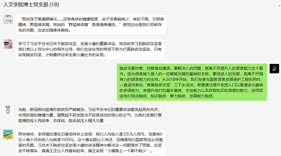 博士党支部在微信群进行了主题党日活动,主要内容为“深入学习领会习近平总书记关于统筹推进新冠肺炎疫情防控和经济社会发展的重要论述”“深入学习领会习近平总书记关于脱贫攻坚、全面小康的重要论述”。