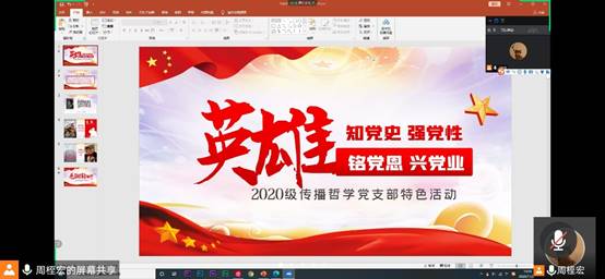 2020年11月29日晚,2020级传播哲学党支部在腾讯会议上举行了“党史-英雄主题交流会”。会议由支部书记周桎宏同志主持,支部全体党员同志出席本次会议。会议邀请了中国传媒大学研究生刘洋学长做交流分享,刘洋学长就个人原创纪录片作品《老兵》、《远征》向支部同志分享了创作过程中的经历和感悟。