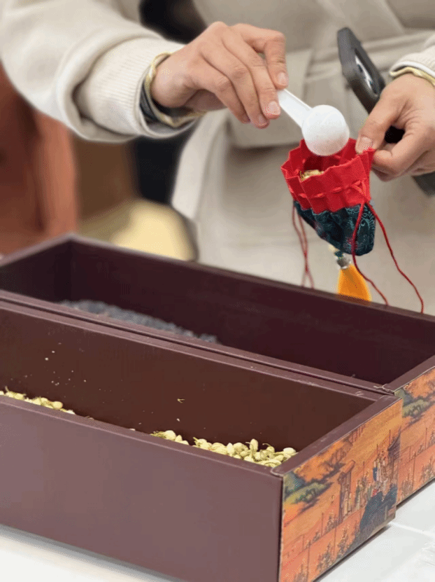 手作香囊茶包则充满趣味与互动性。合欢花、玫瑰花、薄荷、冰片等中药材散发的阵阵清香弥漫在整个活动现场。学院工会为老师们购置了香囊,由老师们根据自身需求在药剂师的指导下制作。在香囊制作过程中,老师们既可以依照提前准备的 “安神香囊”“提神车载香囊”等经典配方进行制作,也可以在深入了解中药材功效的基础上,自主搭配药材,制作独具个性的香囊。茶包制作区域,医师们提前磨制好粗茶粉末,师生们根据自身需求,将粉末装入泡茶袋并绑紧,制成具有美容养颜、补气血功效的养生茶包。