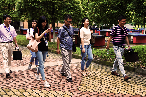 17级新生寝室分布在位于北区的天佑斋18栋和19栋,离迎新点较远。天空中飘着丝丝小雨,老师们在走访了研究生寝室后,迎着雨滴一路步行至天佑斋18栋。