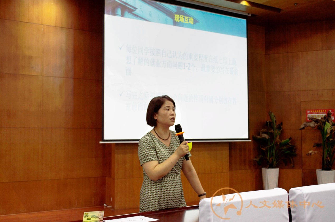 接着,招生就业处黄处长上台为同学们介绍了就业情况及就业准备。黄处长首先与现场同学进行互动,请每位同学在纸上写上最想了解的就业方面的问题,随后一一进行了解答。黄老师从就业形势、就业合理定位、职业准备三方面介绍了如何准备就业。黄老师着重介绍了就业形势,提到许多同学忽略宏观就业形势,导致错失机会或选错方向。她谈到,就业形势如今面临结构性矛盾,同学们应该了解矛盾所在,根据就业形势以及自身条件选择合适的目标。在介绍就业合理定位时,黄老师展示了往届爱看影视
