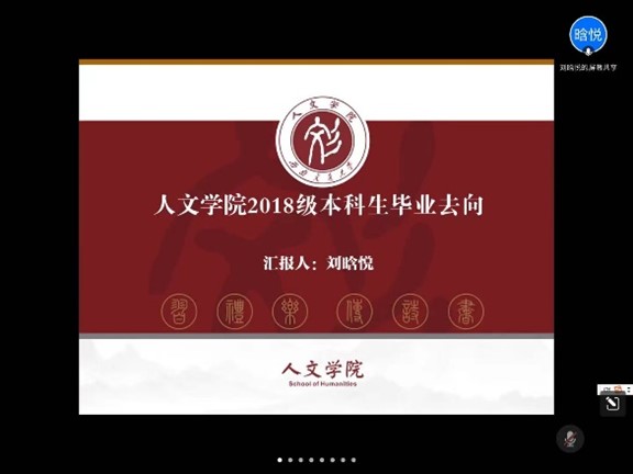 会议伊始,18级辅导员刘晗悦老师介绍了学院18级本科生的毕业去向。刘晗悦老师的讲解分为三个板块,分别是国内升学情况、出国境留学情况及就业情况。她从免研和考研上岸两个方面向大家介绍了18级本科生的国内升学情况,接着介绍了出国留学同学所去院校及就业所去公司,最后刘老师希望19级同学要珍惜“应届毕业生”身份,珍惜青春时光!