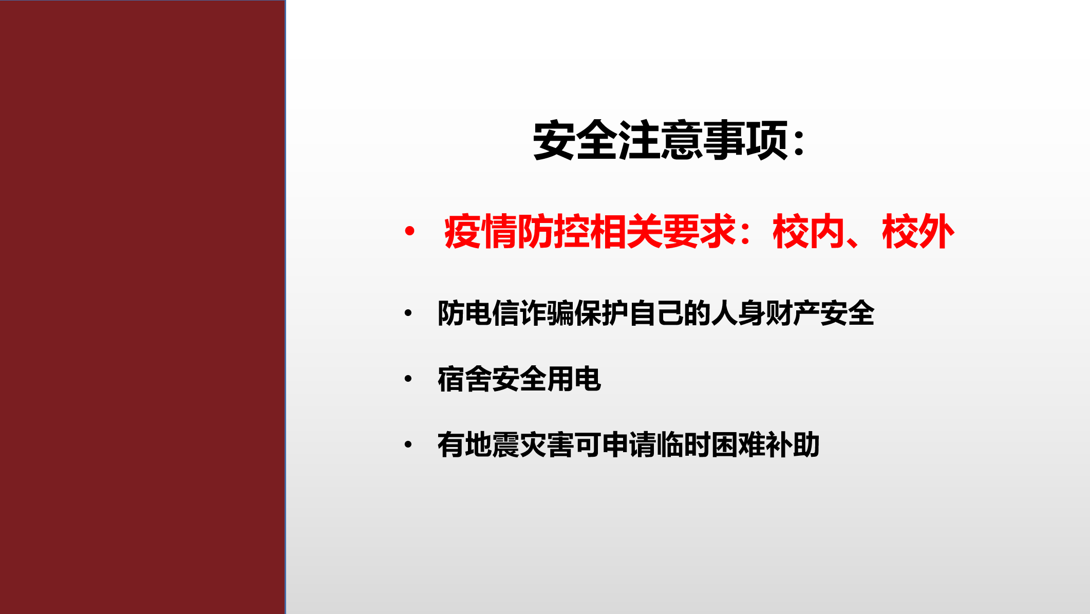 卢琴老师首先强调校园安全问题,从疫情防控要求、预防电信诈骗、宿舍安全用电、地震灾害需知几个方面展开阐述,确保学生保障自身生命财产安全,自觉遵守相关规定,进一步提高自身的安全意识。