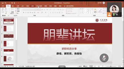 针对2023届毕业生热心关切的就业问题开展了“青春就业大讲堂——朋辈讲坛”主题活动。研究生辅导员卢琴老师分别邀请了在中小学教育行业工作的薛佳、事业单位工作的郝欢欢、国家烟草局工作的肖俊怡三位优秀毕业生进行分享。