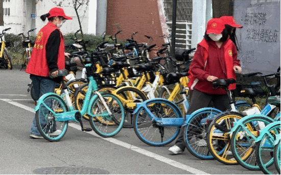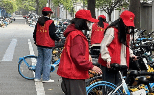 北区四食堂前,协同开展“共享单车整理”劳动实践活动。志愿者们准时集合,穿上统一马甲,戴好标志性红帽,按照预先分配好的任务,有条不紊地开始对乱停放的共享单车进行重新排列与归置,以恢复通行秩序,确保行人安全。