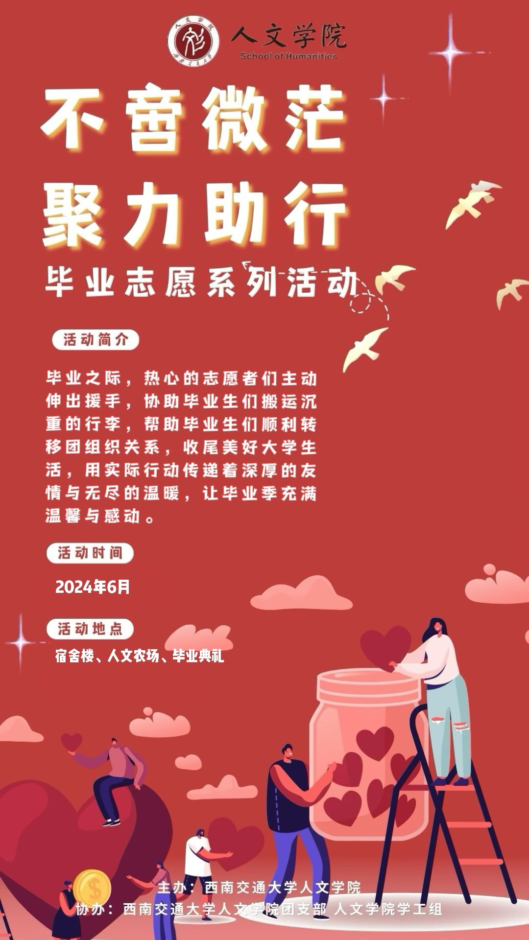 四个春夏秋冬,不过是弹指一挥间。但是,我们的故事未完待续,在即将离开学校的最后一点时间,我们可以参加一次毕业活动、一次座谈、一次劳动、一个典礼、一次实践……情系交大,在校园留下你们的身影。在此,我们特向毕业生同学发出“毕业捐赠献爱心”的倡议:将不用的书籍等物品赠送给低年级的学弟学妹们,将临别的爱心和关怀留给学弟学妹们,予之爱心相传,留之万千风景。