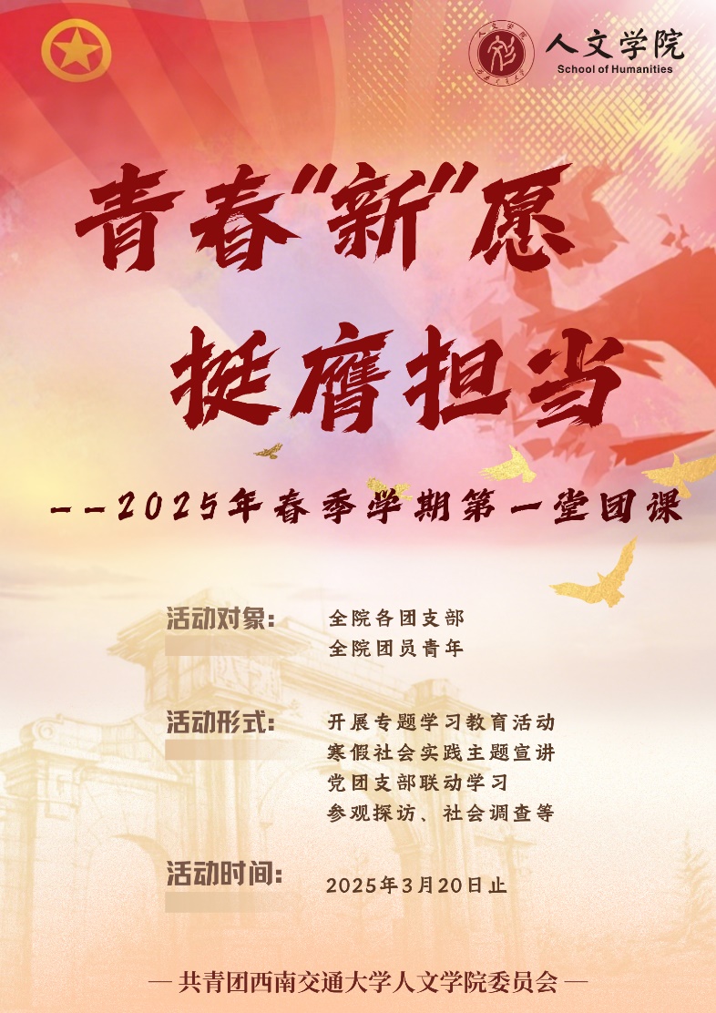 团委开展“青春‘新’愿,挺膺担当”2025年春季学期第一堂团课通知如下。