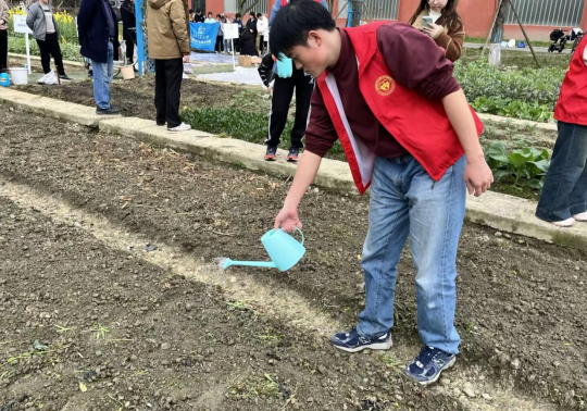 春阳煦暖,沃土新翻。活动伊始,同学们有序领取劳动工具后,仔细地刨除杂草、认真地松土。在专业人员指导下,同学们手持水壶往返于水源与田地之间,小心翼翼地浇灌着每一寸土地。