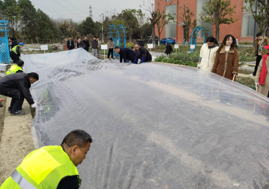春景如画,协作覆膜。覆膜环节,专业人员现场演示,讲解要点,随后指导同学们进行实际操作。同学们两两协作,一人负责展开地膜,使其平整覆盖土地,另一人则用土压实边缘,合力完成春季播种任务。