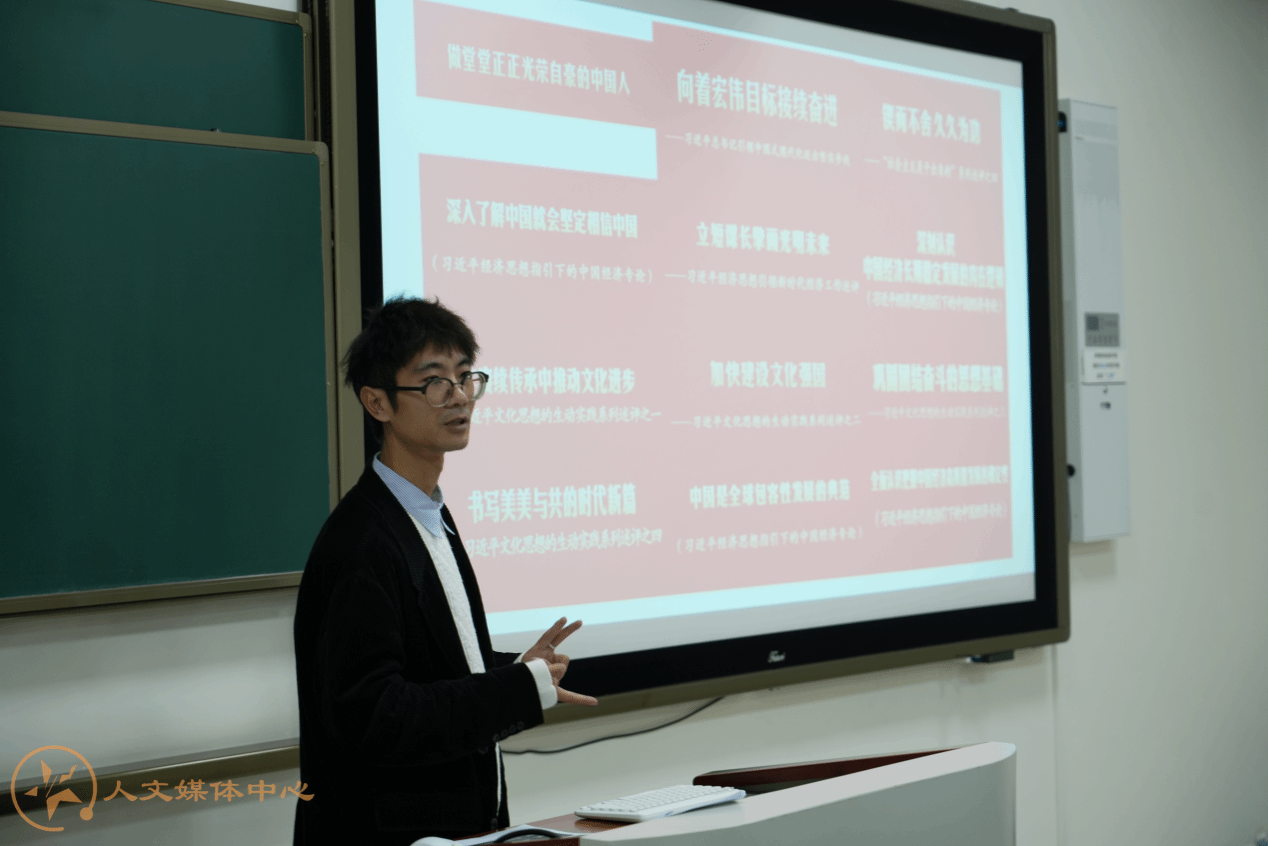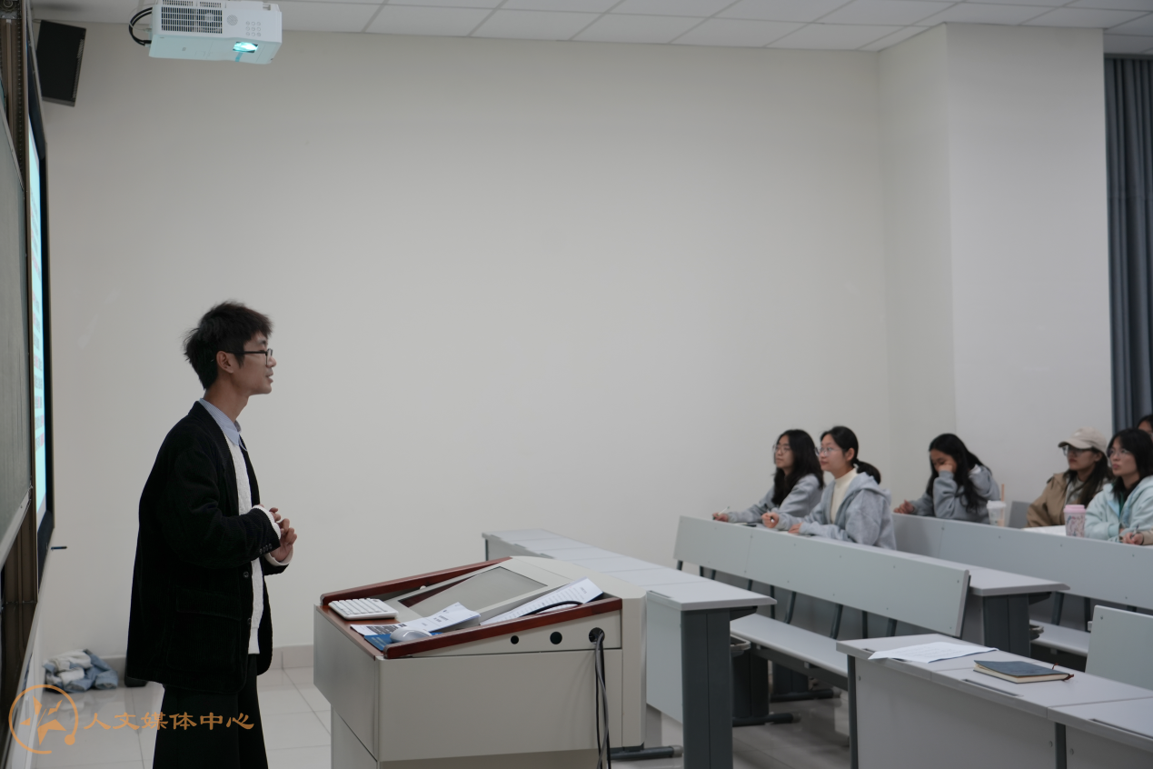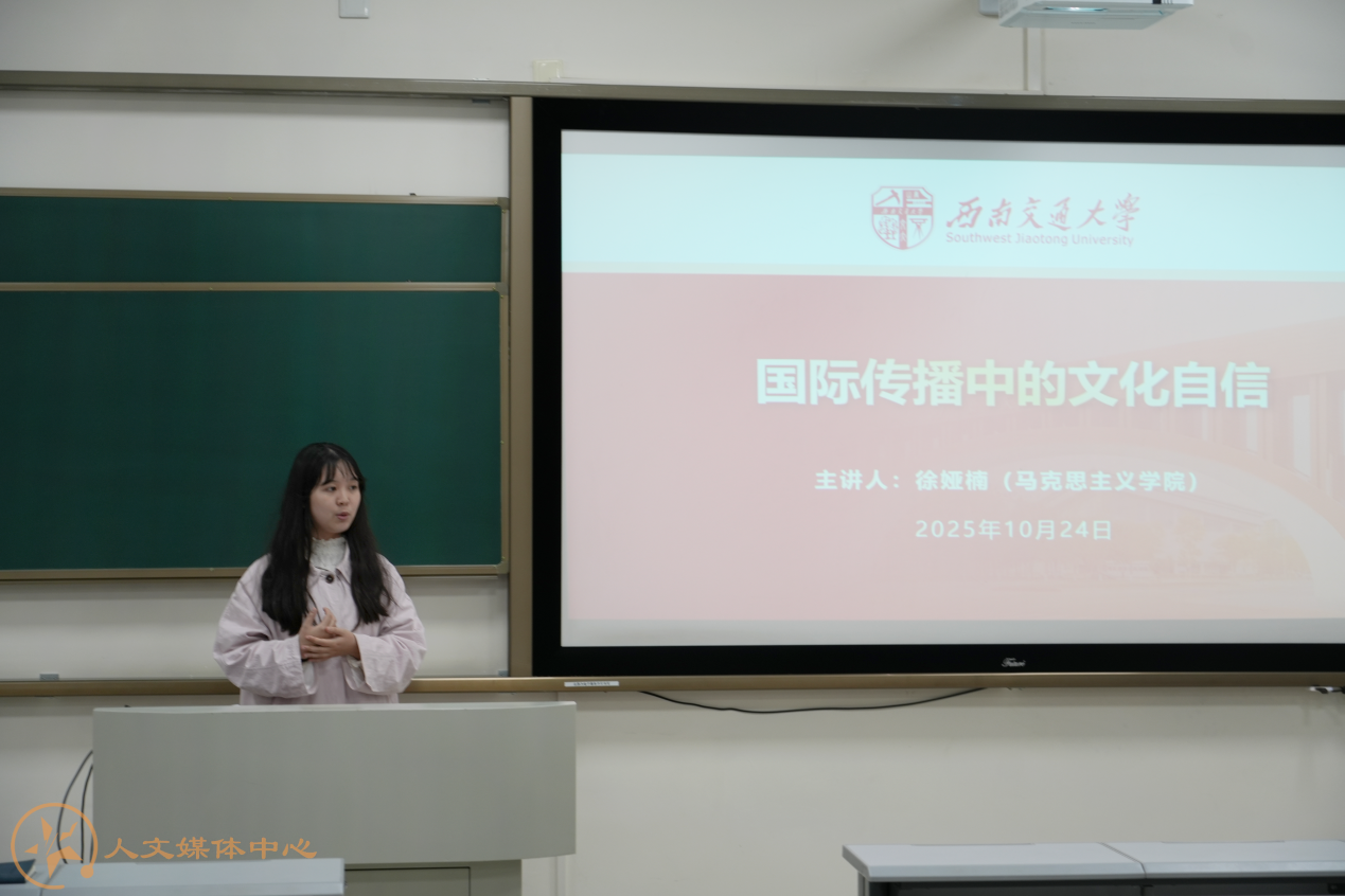 马克思主义学院徐娅楠老师主讲。聚焦“国际传播中的文化自信”,徐老师从四个层面展开讲授。在文化现象分析中,结合中国文化出海典型案例,展示我国在商业、生活美学及跨文化交流领域的成果,凸显文化自信的现实意义;在理论认知部分,联系马克思主义文化观与习近平文化思想,解析文化自信的内涵及其对民族振兴与文化安全的重要意义;在重要性与紧迫性探讨中,从内在动力、外部压力与历史机遇三方面,说明当前强化文化自信的必要性;最后在青年实践方面,她鼓励学生骨干“向内生根,做传统文化创新者;向外开拓,做跨文化对话摆渡人;向下扎根,做中国现实观察者”,为同学们践行文化自信指明具体方向。
