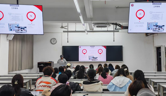 学生代表大会等内容。随后,刘梦薇进一步提出了学生骨干的基本工作要求,细致讲解了完成工作中的注意事项,如工作时须佩戴工作牌、严格遵守流程规范等。最后,她强调全体学生骨干应明确角色定位,积极发挥引领作用,在思想觉悟、学习能力和道德修养等方面不断进步,全面提升服务同学的素质和能力。