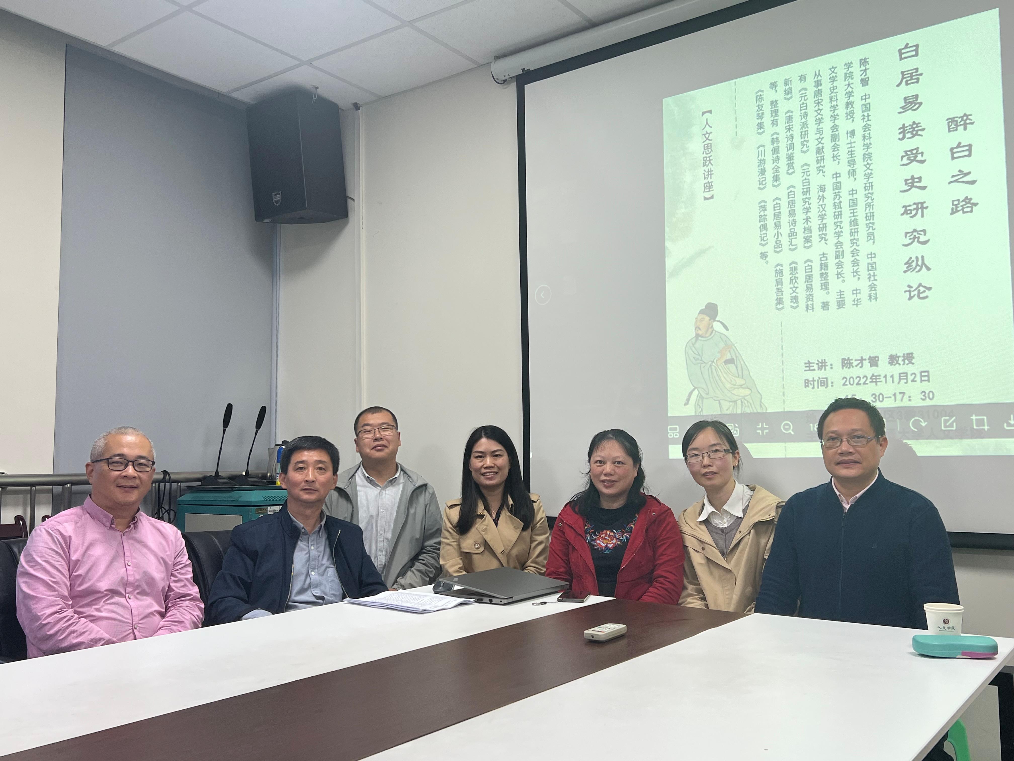 2022年11月2日下午,中国社会科学院文学研究所研究员陈才智教授应邀来我院,做了题为“醉白之路——白居易接受史研究纵论”的讲座。