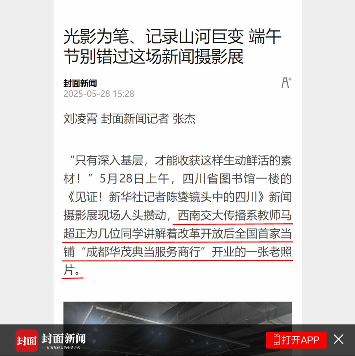 在观展过程中,师生们在全国首家当铺“成都华茂典当服务商行”开业的老照片前久久驻足,马超老师结合自己对成都历史文化的研究经历,详细介绍了这张老照片的历史背景及其反映出的时代意蕴。马老师生动的讲解吸引了在场媒体记者的关注,封面新闻对其现场讲解的情景进行了特别报道。