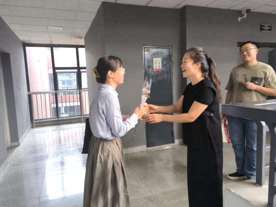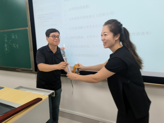 党委书记罗妍妍在学院工会主席刘爽和院办主任彭剑的陪同下,走进教室为辛勤耕耘在教学一线的每一位教师亲手献上一份礼物,表达诚挚的敬意与祝福。在文学理论课堂上,罗书记将一束清新的鲜花和饮品递到老师手中,感谢他一直以来耐心细致的教导。讲台之下,同学们也齐声向老师表达节日祝愿,浓浓师生情谊流淌在整个教室,温暖而动人。同学们表示,学院的老师们常年坚守讲台传道授业,始终以“因材施教”的智慧与“勤学笃行”的躬耕姿态,践行着立德树人的崇高使命,用实际行动谱写教育强国的崭新篇章,深刻展现了人文学者深厚的学术素养与温暖的教育情怀。