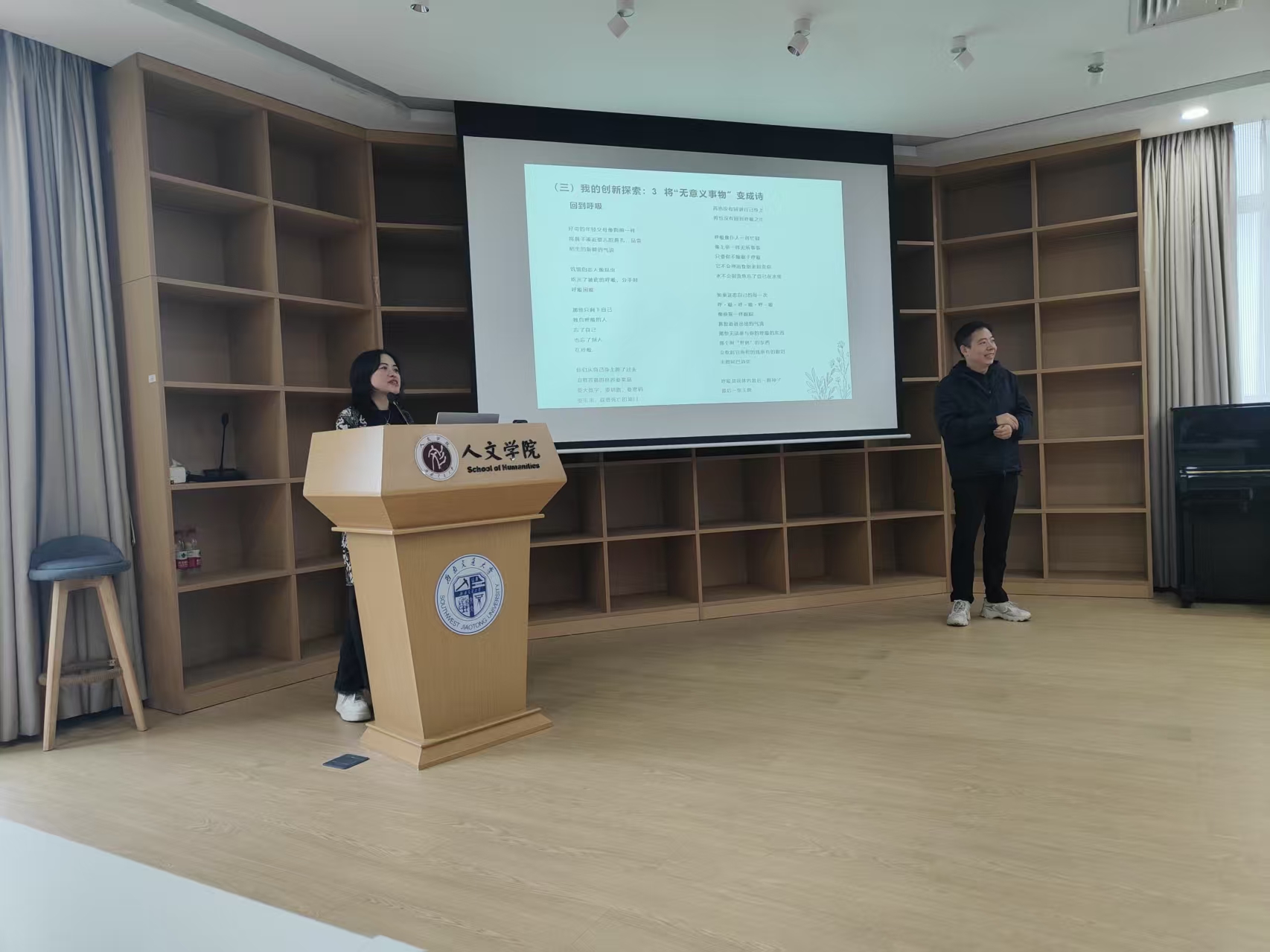 周东升老师首先做了精彩的开场白,介绍了诗人吕约的创作成就、诗坛的评价及个人的认识;进入正题,吕约教授以“诗歌的阅读、创作与审美”为主线展开分享。她首先剖析了诗歌的文体本质,指出诗歌作为一种“以少胜多的艺术”,通过凝练的语言与巧妙的留白,传递出丰富的意蕴;随后,她聚焦于“诗心”这一核心概念,阐释其作为“本真与智慧的辩证统一”:既需葆有生命的纯粹与赤诚,亦应具备经岁月沉淀的深刻体悟。在论及“诗艺”时,吕约教授将诗歌语言喻为“词语的炼金术”,着重强调其创造性与表达上的精准。讲座后半段,她结合九首经典诗作,简要分享了诗歌文本的解读方法,使理论阐释与文本实践紧密结合。