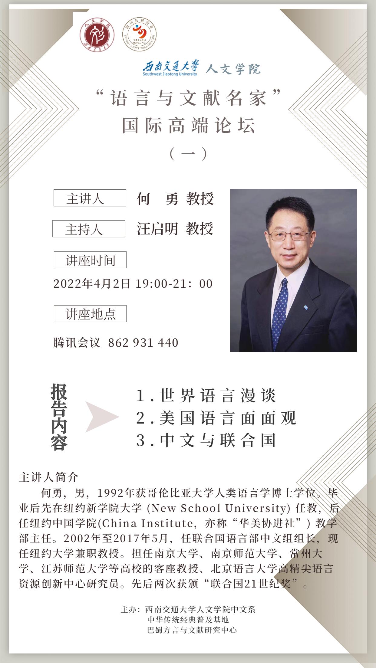 何勇,男,1992年获哥伦比亚大学人类语言学博士学位。毕业后先在纽约新学院大学 (New School University) 任教,后任纽约中国学院(China Institute,亦称“华美协进社”) 教学部主任。2002年至2017年5月,任联合国语言部中文组组长,现任纽约大学兼职教授。担任南京大学、南京师范大学、常州大学、江苏师范大学等高校的客座教授、北京语言大学高精尖语言资源创新中心研究员。先后两次获颁“联合国21世纪奖”。