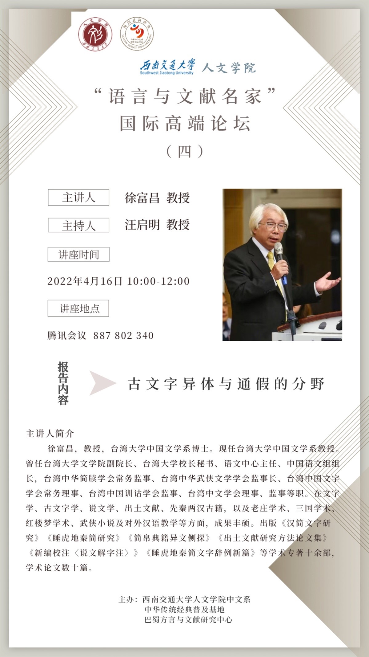 徐富昌,教授,台湾大学中国文学系博士。现任台湾大学中国文学系教授。曾任台湾大学文学院副院长、台湾大学校长秘书、语文中心主任、中国语文组组长,台湾中华简牍学会常务监事、台湾中华武侠文学学会监事长、台湾中国文字学会常务理事、台湾中国训诂学会监事、台湾中文学会理事、监事等职。在文字学、古文字学、说文学、出土文献、先秦两汉古籍,以及老庄学术、三国学术、红楼梦学术、武侠小说及对外汉语教学等方面,成果丰硕。出版《汉简文字研究》《睡虎地秦简研究》《简帛典籍异文侧探》《出土文献研究方法论文集》《新编校注〈说文解字注〉》《睡虎地秦简文字辞例新篇》等学术专著十余部,学术论文数十篇。