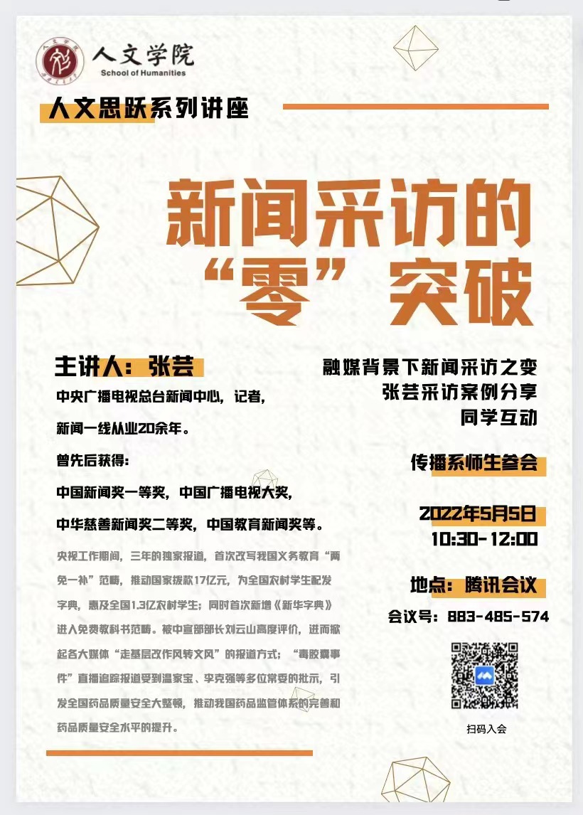 本次讲座内容:张芸老师分享20多年的记者生涯中的采访案例为主线,探讨融媒背景下传媒业发生的深刻变革。张芸老师还将在线上与同学们互动,回答同学们关心的问题。
