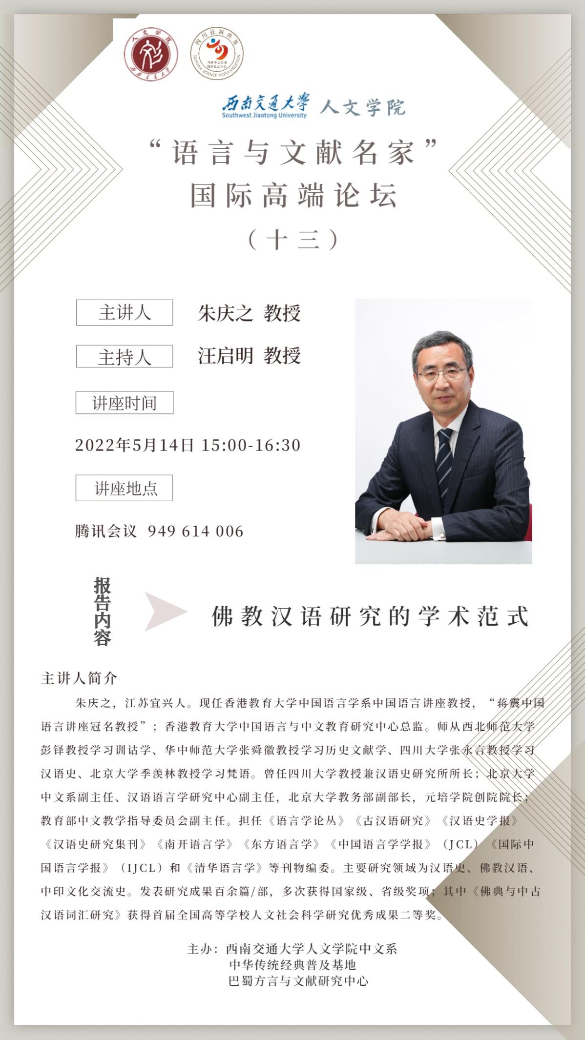 朱庆之,江苏宜兴人。现任香港教育大学中国语言学系中国语言讲座教授,“蒋震中国语言讲座冠名教授”;香港教育大学中国语言与中文教育研究中心总监。师从西北师范大学彭铎教授学习训诂学、华中师范大学张舜徽教授学习历史文献学、四川大学张永言教授学习汉语史、北京大学季羡林教授学习梵语。曾任四川大学教授兼汉语史研究所所长;北京大学中文系副主任、汉语语言学研究中心副主任,北京大学教务部副部长,元培学院创院院长;教育部中文教学指导委员会副主任。担任《语言学论丛》《古汉语研究》《汉语史学报》《汉语史研究集刊》《南开语言学》《东方语言学》《中国语言学学报》(JCL)《国际中国语言学报》(IJCL)和《清华语言学》等刊物编委。主要研究领域为汉语史、佛教汉语、中印文化交流史。发表研究成果百余篇/部,多次获得国家级、省级奖项;其中《佛典与中古汉语词汇研究》获得首届全国高等学校人文社会科学研究优秀成果二等奖。