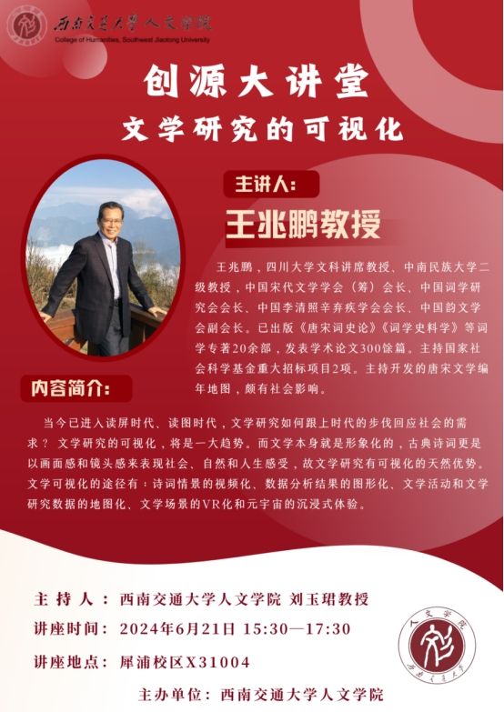 主讲人介绍:王兆鹏,四川大学文科讲席教授、中南民族大学二级教授,中国宋代文学学会(筹)会长、中国词学研究会会长、中国李清照辛弃疾学会会长、中国韵文学会副会长。已出版《唐宋词史论》《词学史料学》等词学专著20余部,发表学术论文300馀篇。主持国家社会科学基金重大招标项目2项。主持开发的唐宋文学编年地图,颇有社会影响。