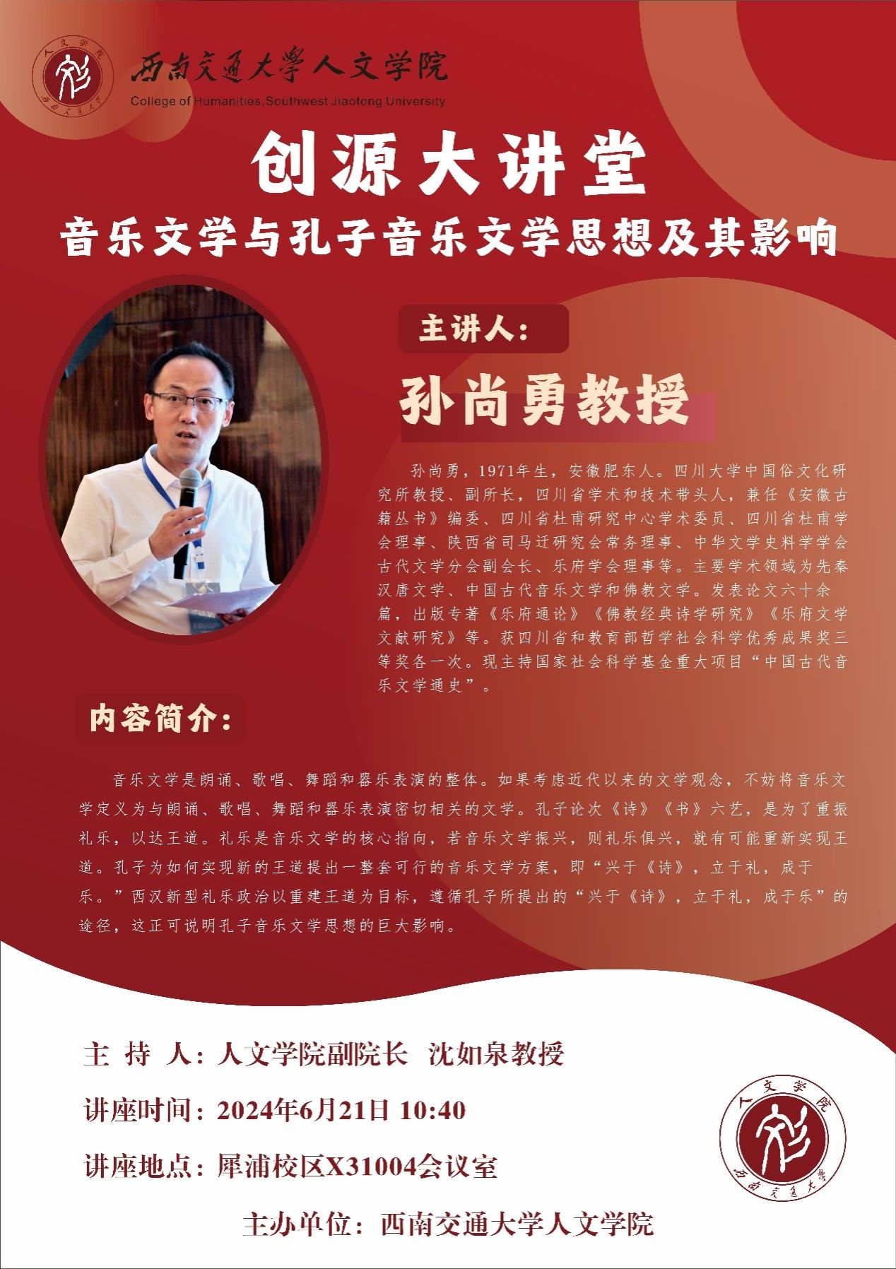 主讲人介绍:孙尚勇,1971年生,安徽肥东人。四川大学中国俗文化研究所教授、副所长,四川省学术和技术带头人,兼任《安徽古籍丛书》编委、四川省杜甫研究中心学术委员、四川省杜甫学会理事、陕西省司马迁研究会常务理事、中华文学史料学学会古代文学分会副会长、乐府学会理事等。主要学术领域为先秦汉唐文学、中国古代音乐文学和佛教文学。发表论文六十余篇,出版专著《乐府通论》《佛教经典诗学研究》《乐府文学文献研究》等。获四川省和教育部哲学社会科学优秀成果奖三等奖各一次。现主持国家社会科学基金重大项目“中国古代音乐文学通史”。