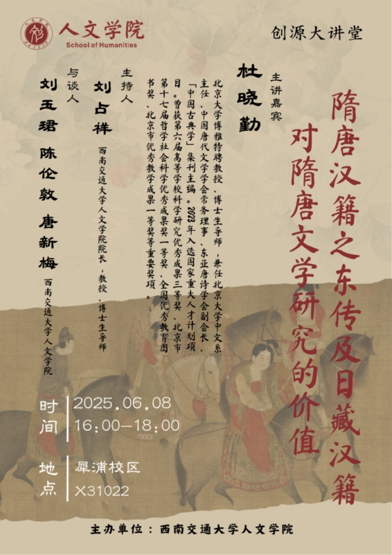 近百年来,中国古代文学研究者多注意利用上世纪初新发现的敦煌残卷中的资料,视为新材料,谓之“预流”,而对数量更多、价值更大的日本古代典籍,则相对关注不够。本次讲座主要根据本人知见和研究心得,从中日古典学交流与融通的层面,讨论日本古代典籍反映的隋唐文学文献在日本王朝时期的流播、日本现存唐集古抄本的文献价值、日本古代文献保存的唐代中日诗人创作交流史料、日本古代典籍保存的唐代诗学文献、日本早期歌学著作与唐代诗格之关系等问题。