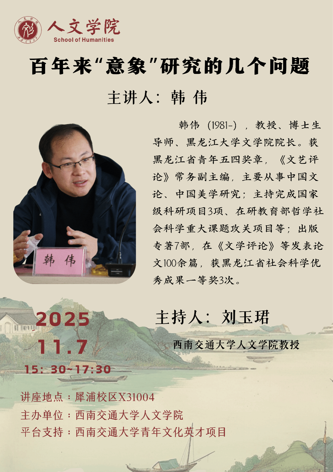 主讲人介绍:韩伟(1981—),教授、博士生导师、黑龙江大学文学院院长。多次入选国家级青年人才计划,获黑龙江省青年五四奖章,《文艺评论》常务副主编,主要从事中国文论、中国美学研究;主持完成国家级科研项目3项、在研教育部哲学社会科学重大课题攻关项目等;出版专著7部,在《文学评论》等发表论文100余篇,获黑龙江省社会科学优秀成果一等奖3次。