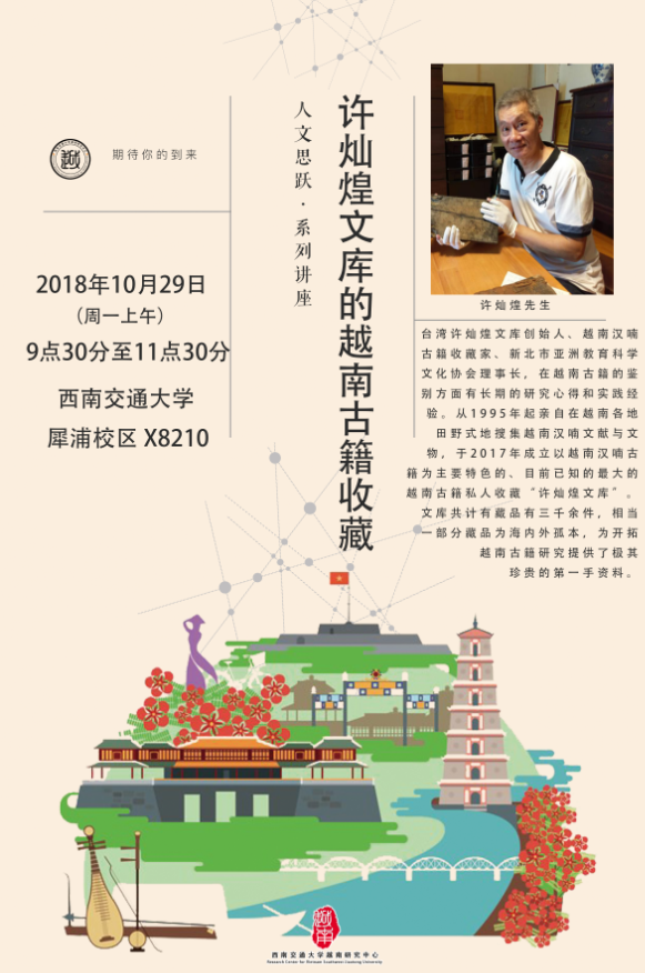 台湾许灿煌文库创始人、越南汉喃古籍收藏家、新北市亚洲教育科学文化协会理事长,在越南古籍的鉴别方面有长期的研究心得和实践经验。从1995年起亲自在越南各地田野式地搜集越南汉喃文献与文物,于2017年成立以越南汉喃古籍为主要特色的、目前已知的最大的越南古籍私人收藏“许灿煌文库”。文库共计有藏品有三千余件,相当一部分藏品为海内外孤本,为开拓越南古籍研究提供了极其珍贵的第一手资料。
