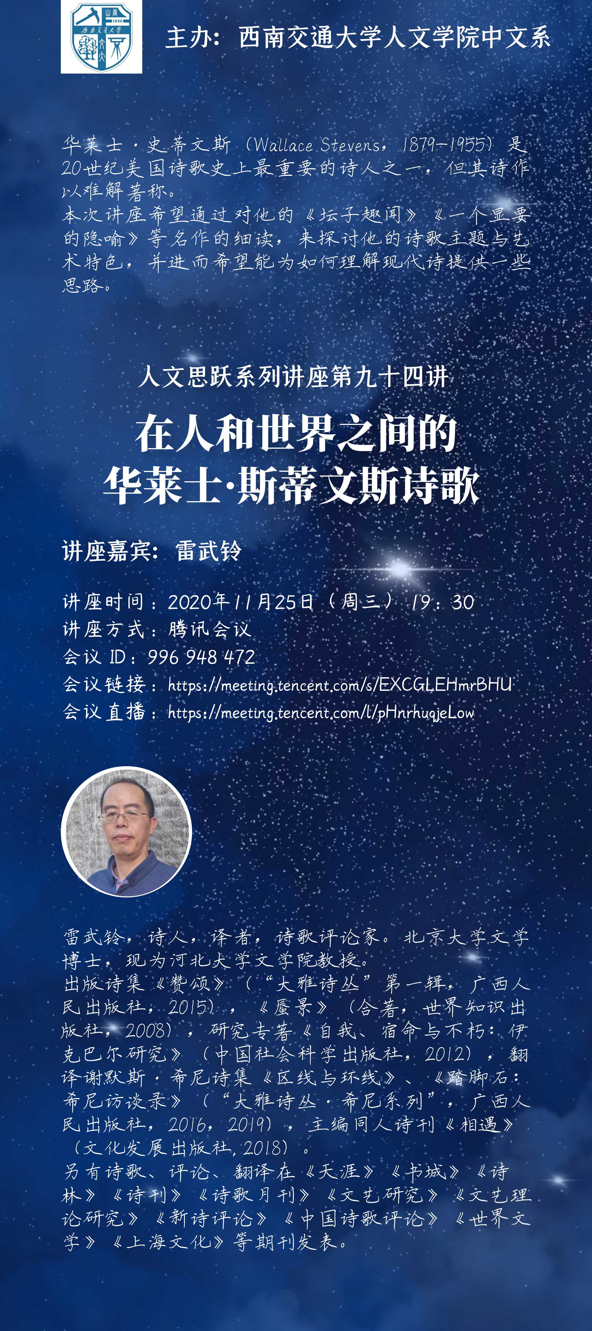 内容简介:华莱士·史蒂文斯(Wallace Stevens,1879—1955)是20世纪美国诗歌史上最重要的诗人之一,但其诗作以难解著称。本次讲座希望通过对他的《坛子趣闻》《一个显要的隐喻》等名作的细读,来探讨他的诗歌主题与艺术特色,并进而希望能为如何理解现代诗提供一些思路。