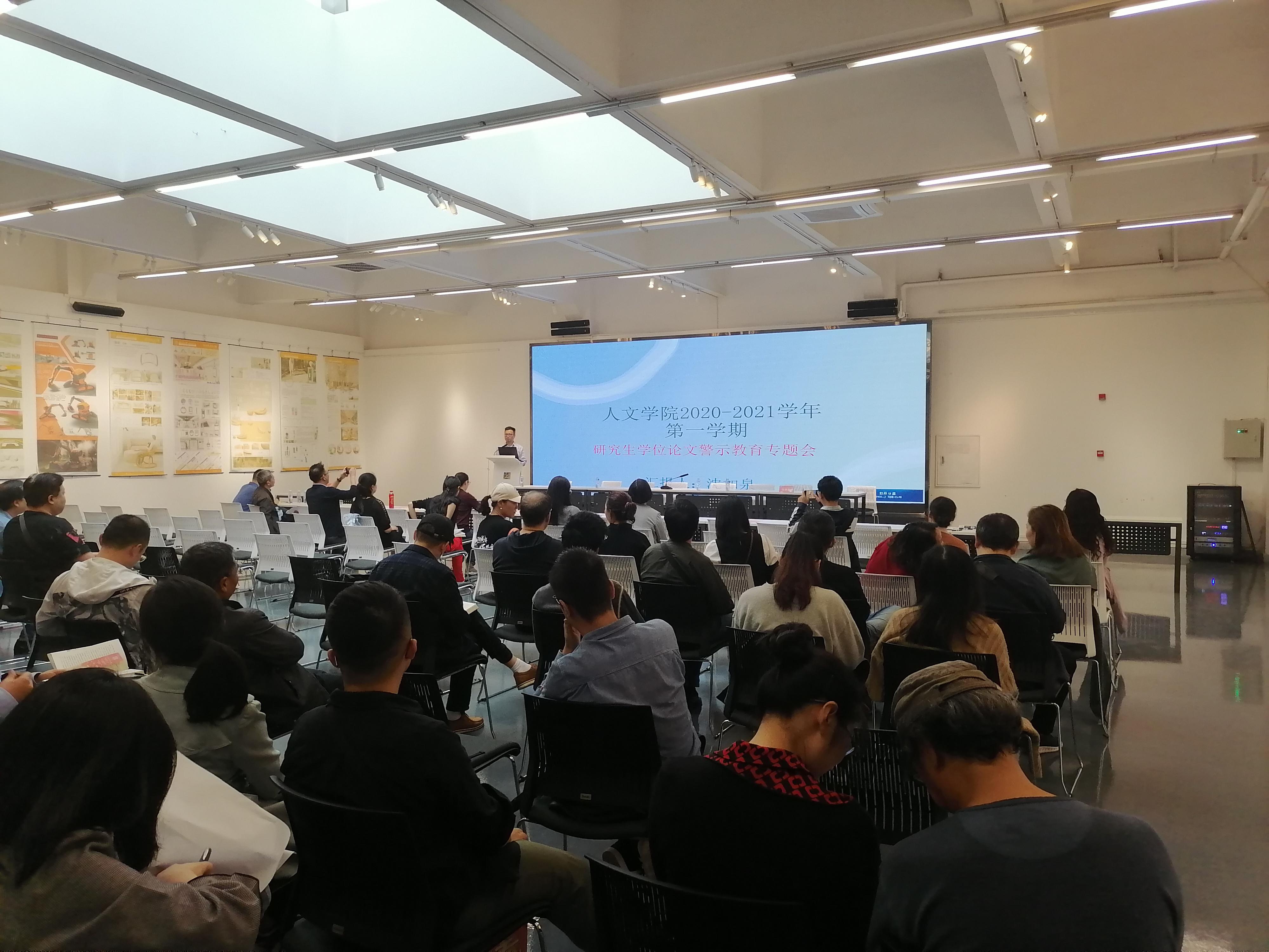 在犀浦校区8教美术馆召开研究生学位论文警示教育专题会。学院全体研究生导师及任课教师、部分学生代表参加会议。会议由沈如泉副院长主持。首先沈副院长代表学院感谢全体师生在疫情期间互相配合顺利完成教学、答辩、招生等一系列工作。随后也强调了研究生培养工作方面存在的问题:研究生培养环节、培养质量等方面存在的隐患多,研究生论文的开题、内审、外审、答辩每个环节都还存在漏洞等。沈如泉副院长组织与会人员学习传达了教育部及学校相关文件精神,宣讲了现行博士、硕士学位论文的抽检结果处理办法,并要求各系所在规定时间内认真开展研究生论文质量警示教育和自查工作。