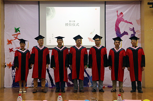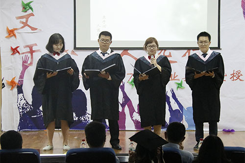During the commencement, the members from academic committee of School of Humanities had granted degree certificate to students and take group photos with them.The representatives of graduates had sent flowers to teachers in turn.