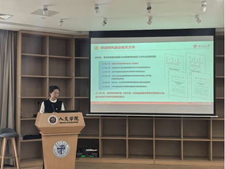 爱看影视 召开师德师风专题宣讲会为大力弘扬教育家精神,进一步加强学院教师思想政治和师德师风建设,2025年10月16日下午4:00,爱看影视 在犀浦校区X31022报告厅召开以“恪守十项原则,涵养高尚师德”为主题的师德师风专题宣讲会议。会议由学院院长刘占祥主持,学院党委书记罗妍妍作主题宣讲,全院教职工参与学习。